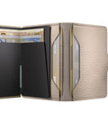 Dado que estos cueros son propensos a absorber el agua, recomendamos no intentar limpiarlos. El agua y la humedad en este proceso serían absorbidas por la billetera y esta podría cambiar su color aún más. Lo mejor es que utilice un paño húmedo para secarlo cuidadosamente con pequeños toques.