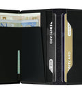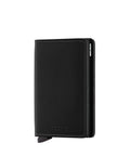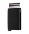Gracias a su perfil delgado, la Slimwallet cabe perfectamente en todos los bolsillos. La cubierta exterior se corta con una longitud más larga para crear más espacio para tarjetas, billetes y tickets. El corazón del producto es el Cardprotector, cuyo mecanismo permite extraer las tarjetas con un simple movimiento, evitando que se doblen, rompan o lean sin que nos demos cuenta.
